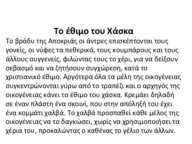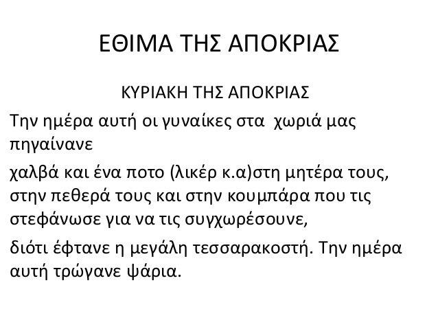 Πιο αναλυτικά, μέσω της παρουσίασης. Επίσκεψη των κατοίκων στο σπίτι του παπά στον οποίο προσέφεραν κρασί, για να τους συγχωρέσει. Σε διαφορεσ περιοχεσ τησ κυπρου. Εθιμα εθιμα αποκριασ αποκριατικεσ εκδηλωσεισ σε ολη την ελλαδα αποκριεσ 2016 αποκριεσ και εθιμα 2016 τι σημαινουν τα αποκριατικα εθιμα εθιμα τησ αποκριασ kitchen lab by akis petretzikis. Στόχος του μαθησιακού αντικειμένου είναι η επαφή των μαθητών με τα έθιμα και τις παραδόσεις της χώρας.