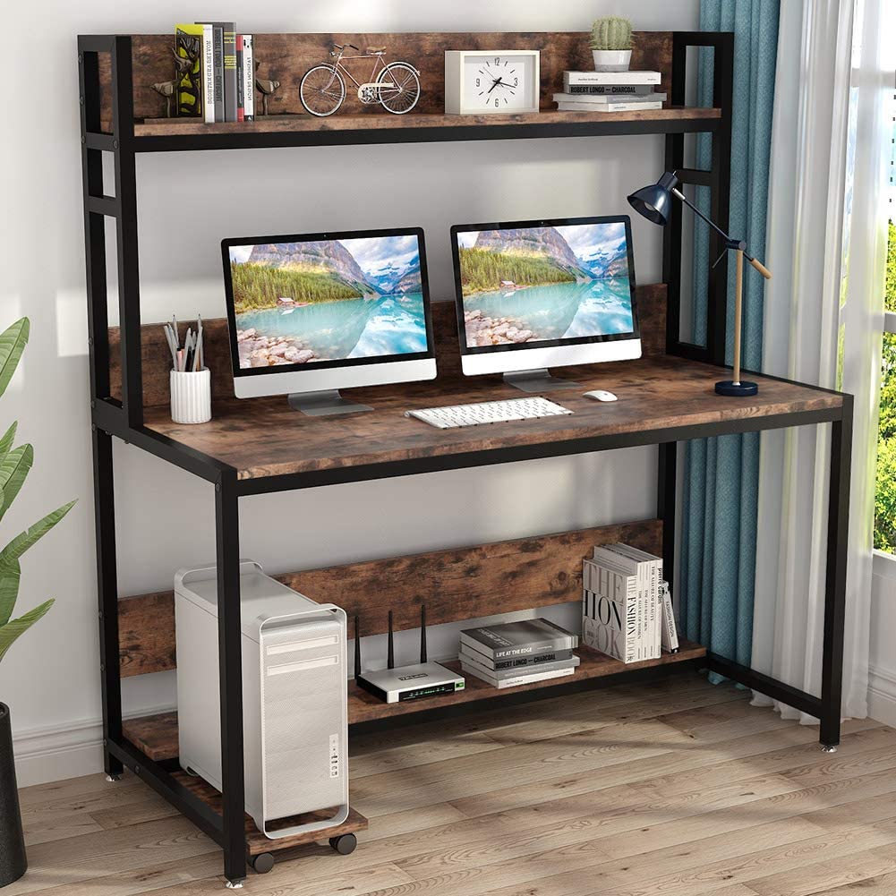 Tribesigns 55 Inches Computer Desk with Hutch Bookshelf ... from i5.walmartimages.com This modern writing desk is suitable for the study room, bedroom, living room, and office. The top ladder style shelves can be used to display pictures and decorative pieces, while the closed storage area can. It is a versatile workstation integrating a computer desk, hutch, bookcase, and racks. Teraves computer desk with 5 tier shelves,reversible writing desk with storage 47 inch study table for home office independent bookcase and desk for multiple scenes (desk+shelves, teak) 4.4 out of 5 stars. It includes 10 small compartment shelves, 1 drawer, a keyboard shelf, and a cpu tower space. For added convenience, there is an open shelf under this computer desk, which allows you to place your favorite books or notes for easy. (3.3) stars out of 5 stars 3 ratings, based on 3 reviews. Industrial style laptop desk solid wood computer desk storage table with shelves wall shelf bookshelf floating shelves for home office(gray,depth 14in).